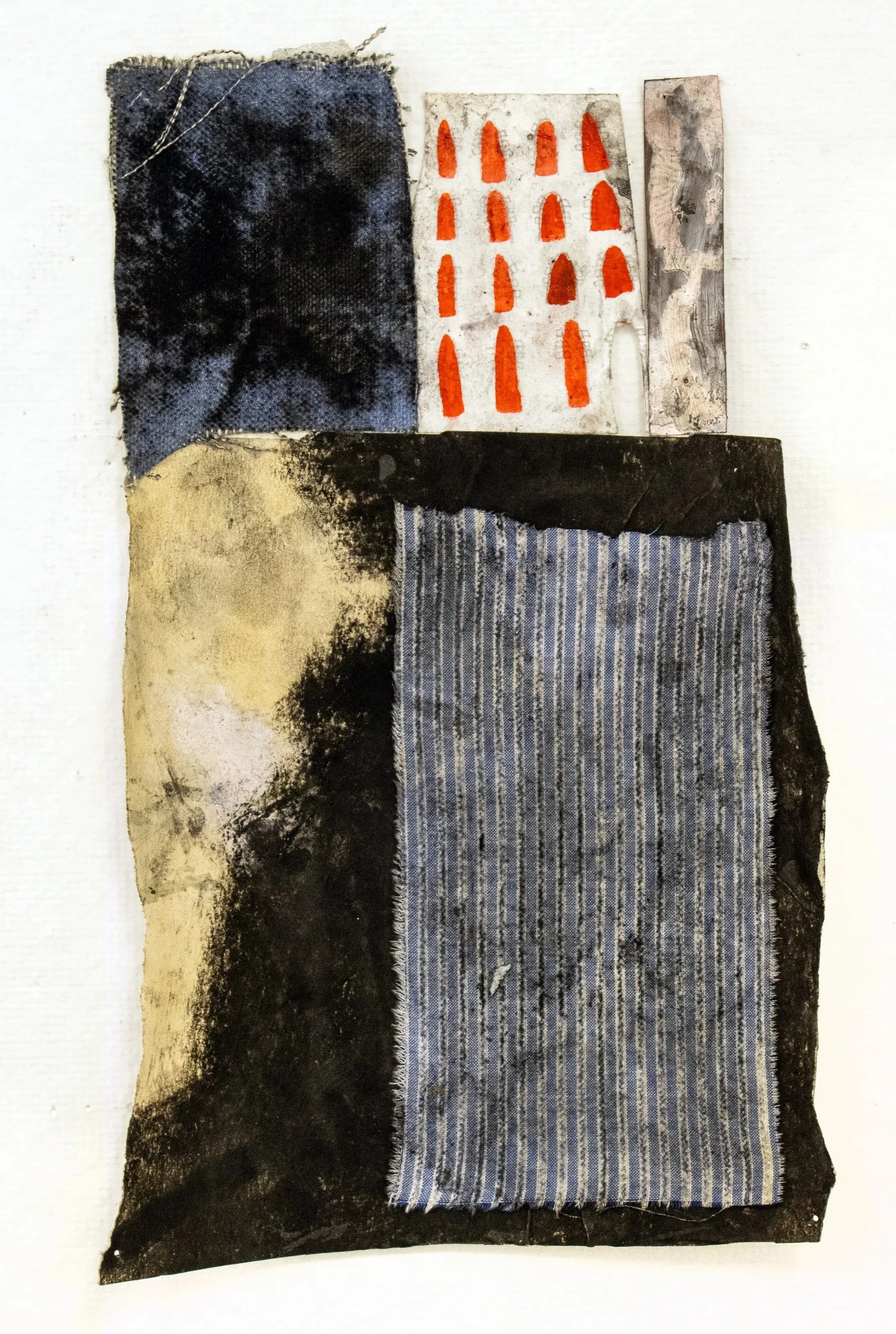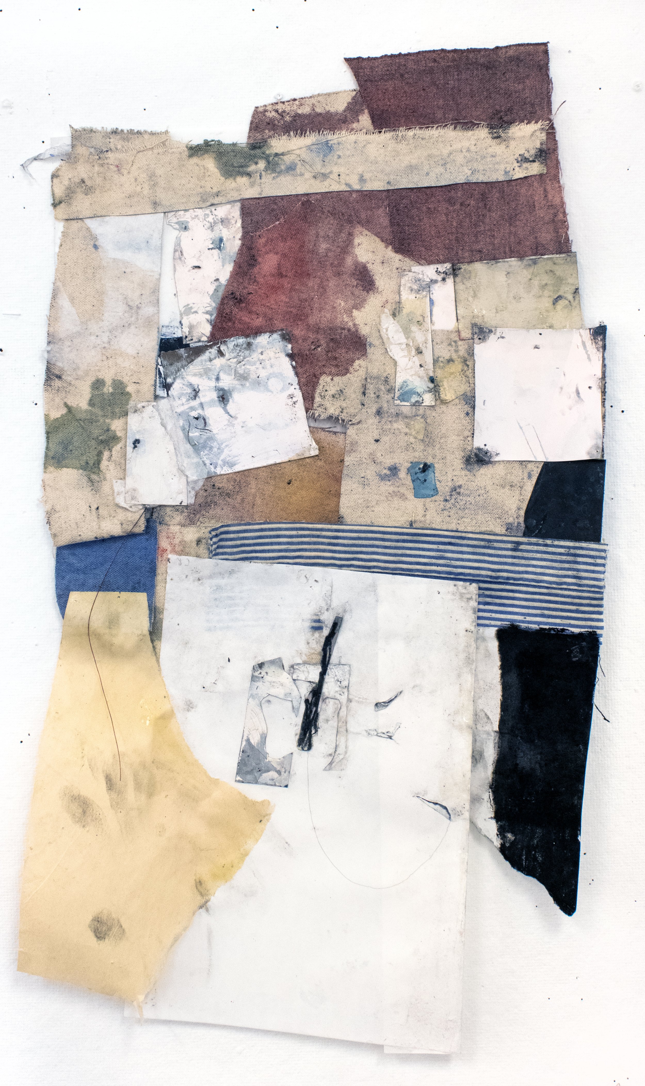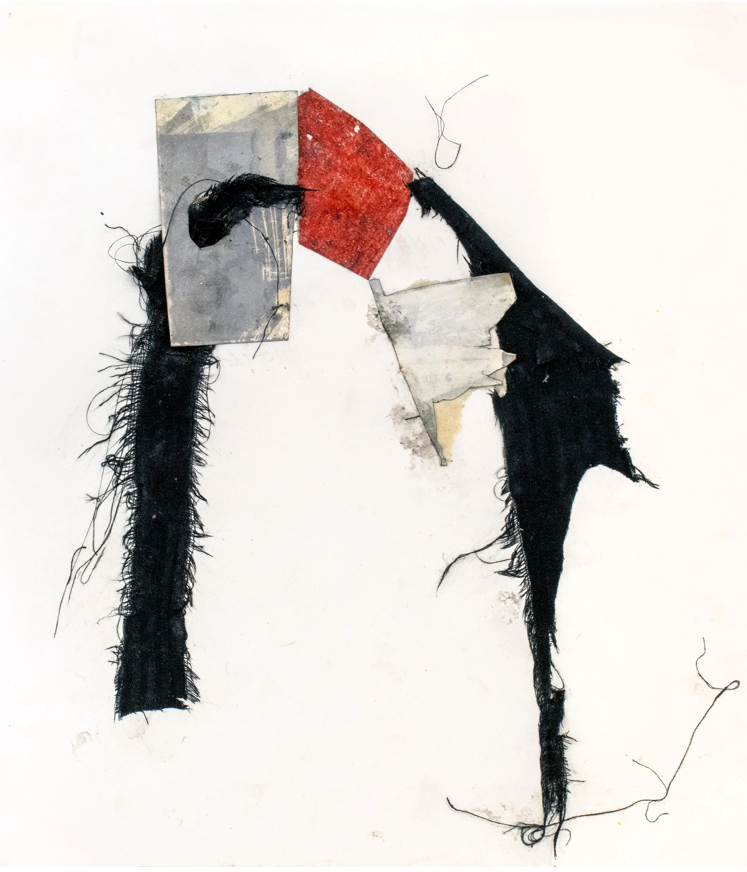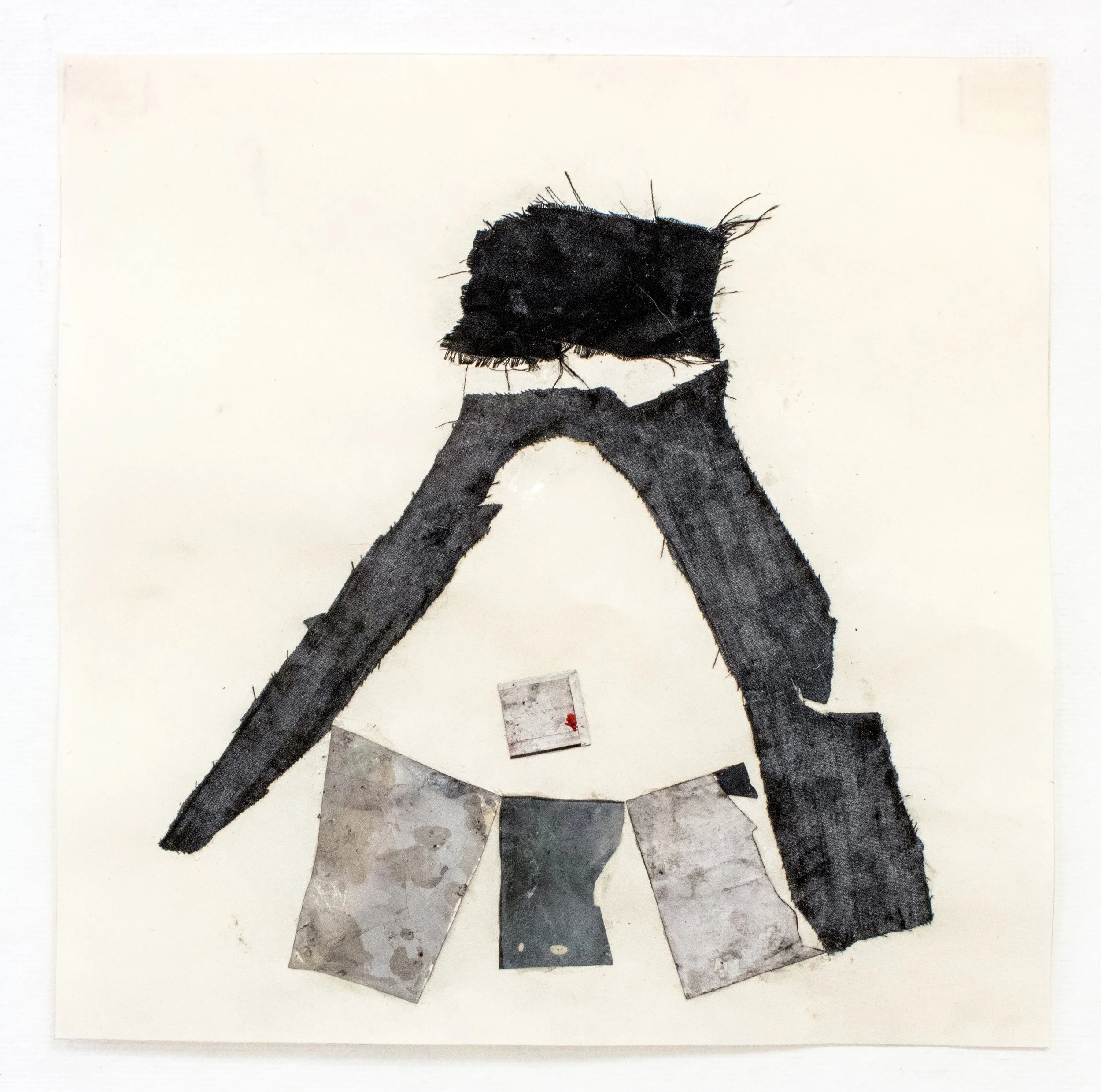 Collage, Polaroid autoportraits, worn fabric, canvas, charcoal, pencil, watercolor, on paper, 8 1/4’’ x 4 1/2’’ 2026.