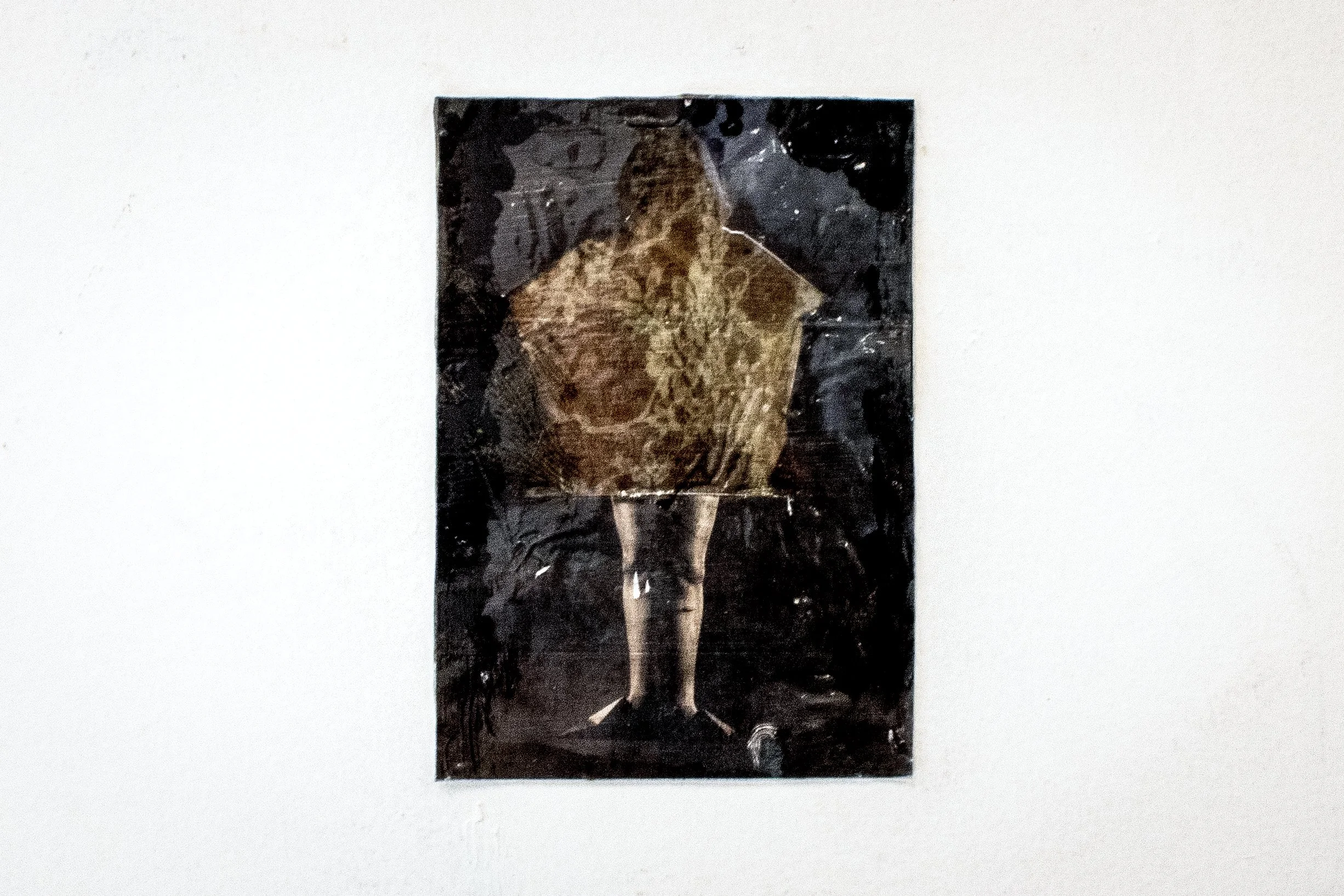 Collage, paper encased in image transferred and mono-printed acrylic skin, 6’’ × 4’’, 2025.