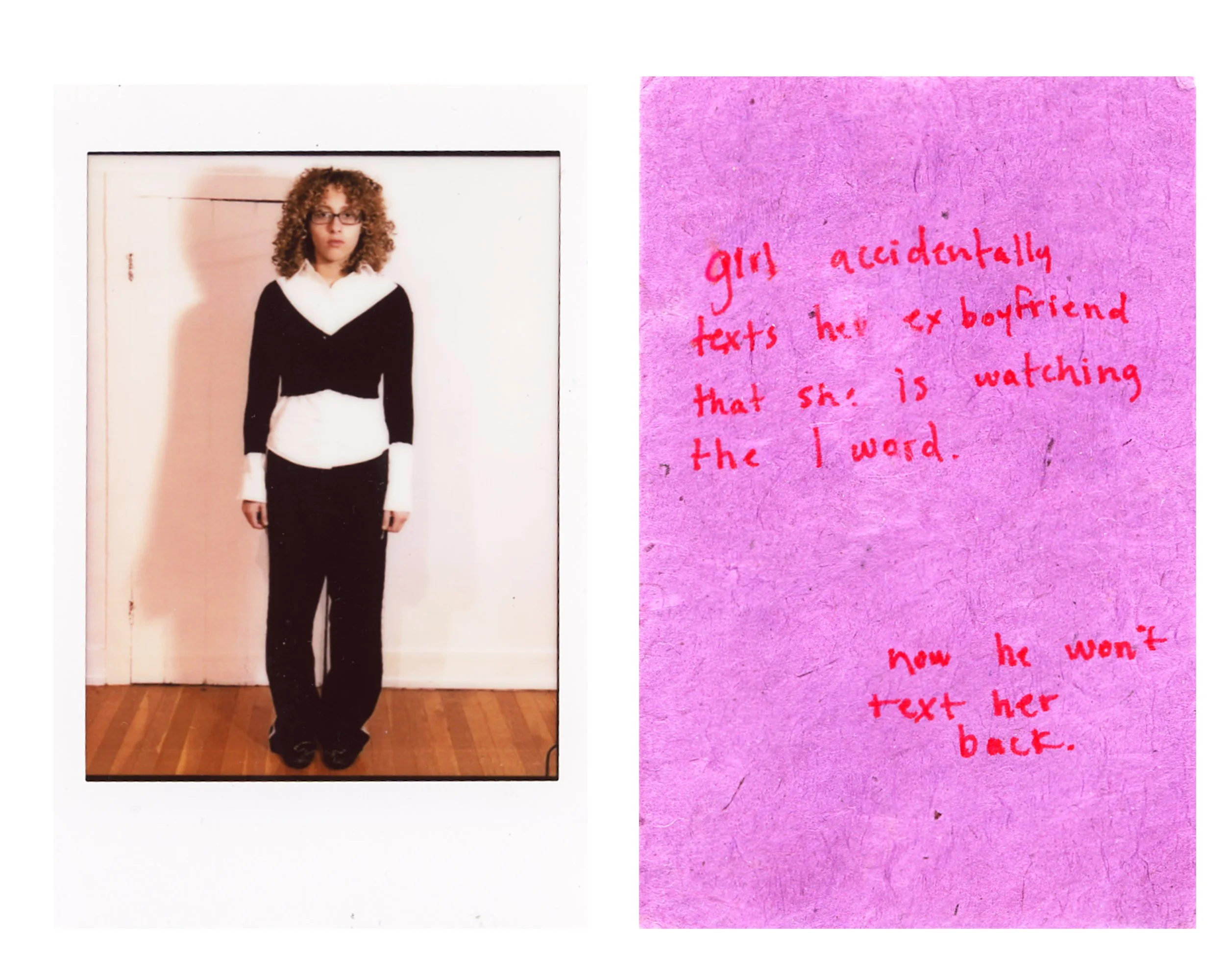 “Girl accidentally texts her ex-boyfriend that she is watching the L-word. Now he won’t text her back,” Untitled Artist Book With Narrative Descriptors no. 1